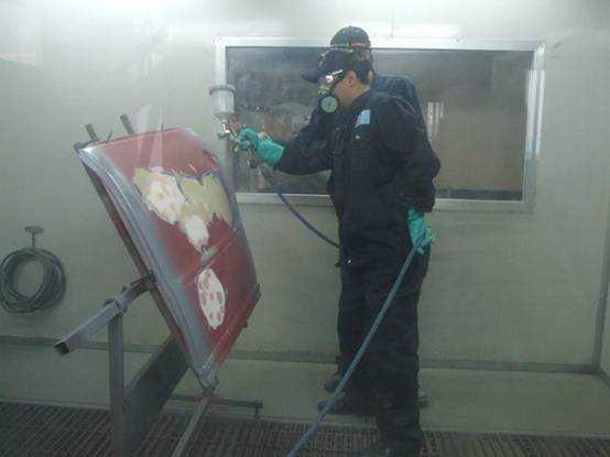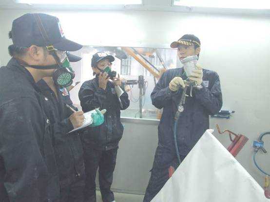 老師們在烤漆房內實操噴槍對鈑件進行底漆噴涂作業(yè),宋老師耐心指導